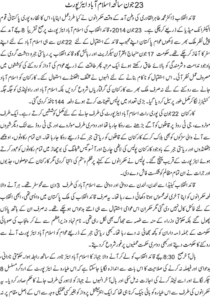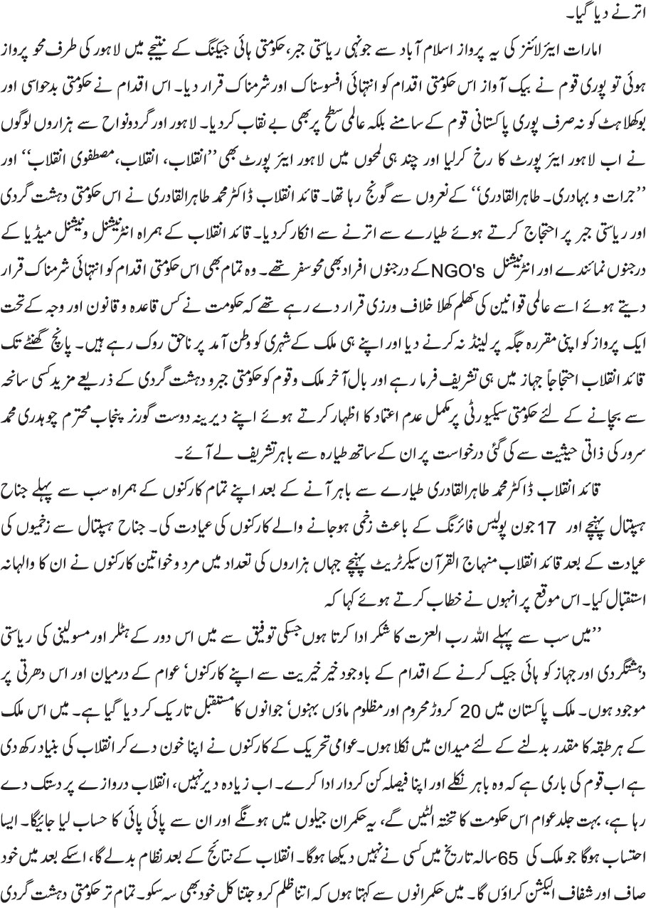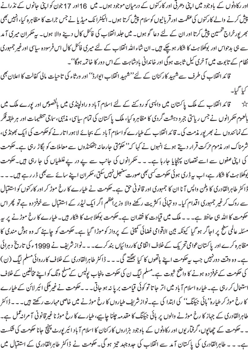 “I ask the rulers to commit as much oppression today as they can face tomorrow. Despite all terrorism and hurdles of the government, I am present among my workers. I pay my homage to those who have offered the ultimate sacrifices of their lives on the intervening night between June 16 and 17. The courage with which electronic media showed the truth live on their TV screens, I also pay them my rich tributes and pray for their well being. I am going to give a call of revolution soon. The rulers have already become nervous due to my arrival and my final call will prove to be the last push in the coffin of this corrupt, obsolete system and this tyrannical reign of family dynasty will end soon.”