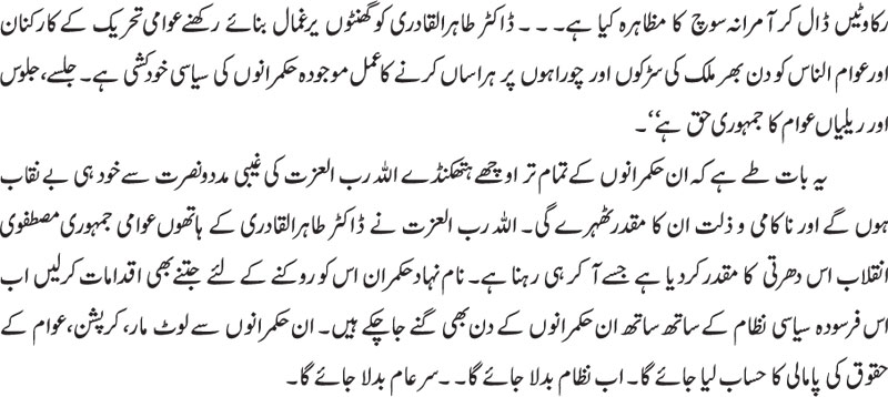 “First of all, I express my gratitude to Allah Almighty with Whose help and blessings I have been able to be among my workers and people despite the worst ever terrorism perpetrated by today’s Hitler and Mussolini and hijacking of plane. The future of 180 million people has been made dark. I have stepped into the arena to change the destiny of every segment of this country. The PAT workers have laid down the foundation of revolution with their blood. It is now turn of the people to come out of their homes and play their due role. Time is not far away. Revolution is now knocking at the doors. Soon the people will send this government home. These rulers will be in jails and every penny they have spent from public exchequer will be audited and accounted for. There would be such stringent accountability as has not been witnessed in last 65 years in the country’s history. He said that revolution will be followed by change in the system and I would hold fair, free and transparent elections myself.