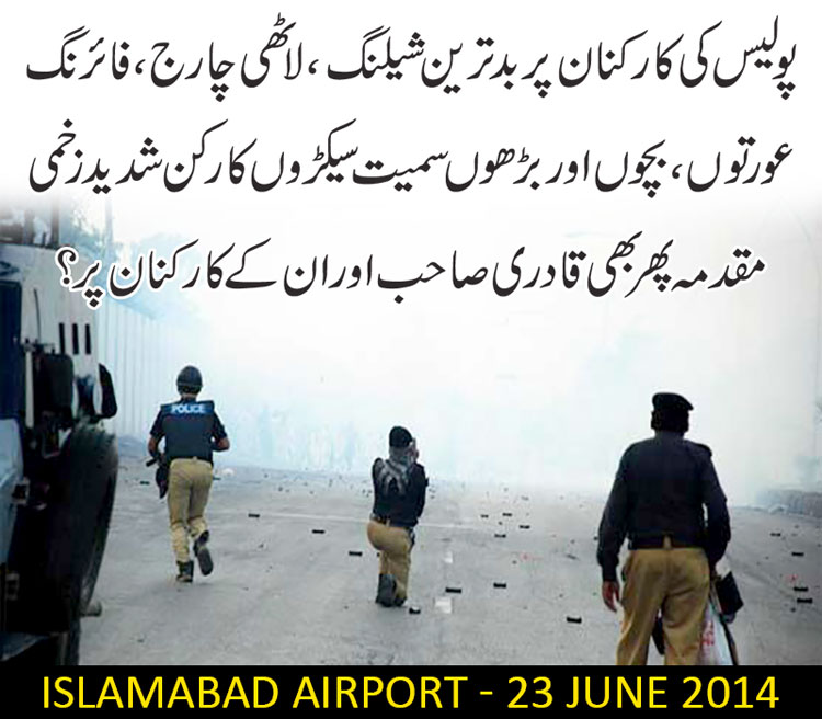 Pakistan’s 24/7 electronic media showed the conduct of the rulers at the time of PAT chief Dr Muhammad Tahir-ul-Qadri’s arrival in Pakistan. The hundreds of thousands of people from across the country left for Islamabad to welcome their beloved leader who was schedule to land at 8:30 a.m. on June 23, 2014. Some of the caravans had started for the capital a day before to be able to reach there on time. However, despite the incident of Model Town in which 14 precious lives were lost as a result of state terrorism, the government did not learn any lesson and chose to mete out the same treatment to the PAT workers that they demonstrated a week ago in total disregard for morality and law. It again made an attempt to crush the voice of people through the use of force. It employed different tactics to thwart the reception of Dr Qadri. It resorted to mass arrests of workers besides placing containers and barricades in various cities. Islamabad and Rawalpindi were sealed off. Heavy police continents were deployed across the province and Clause 144 was imposed.