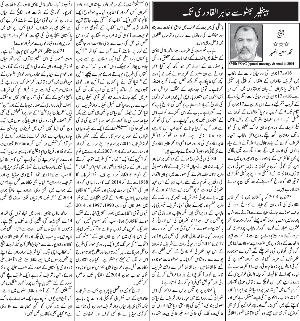 Benazir Bhutto say Tahir-ul-Qadri Tak - by Muhammad Saeed Azhar (Daily Jang, 25 June 2014) Share this Story