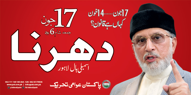 Pakistan Awami Tehreek (PAT) will stage a sit-in against the killers of Model Town martyrs on June 17, 2016 at the Mall Road, Lahore. PAT Chairman Dr Muhammad Tahir-ul-Qadri will lead the sit-in.