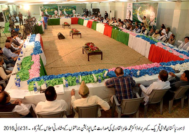 Dr Tahir-ul-Qadri said that in the first phase the protest movement will start on August 6 from Karachi, Lahore, Chiniot, Gujranwala, Faisalabad, Ghotki, Islamabad and on August 16 from Karachi, Lahore, DG Khan, Sialkot, Larkana, Sargodha, Rawalpindi, Faisalabad and on August 20 Hyderabad, Okara, Bahawalpur, Jhelum, Gujranwala, TT Singh, Chiniot and on August 27 Karachi, Lahore, Islamabad, Peshawar, Abbottabad, Bhakkar, Faisalabad, Gujrat and protest rallies and sit-ins will be held in all the cities on the given dates. He said the second and the third phases of the protest movement will be announced after consultation with the joint action committee. He thanked all the political parties for participating in the consultative conference.