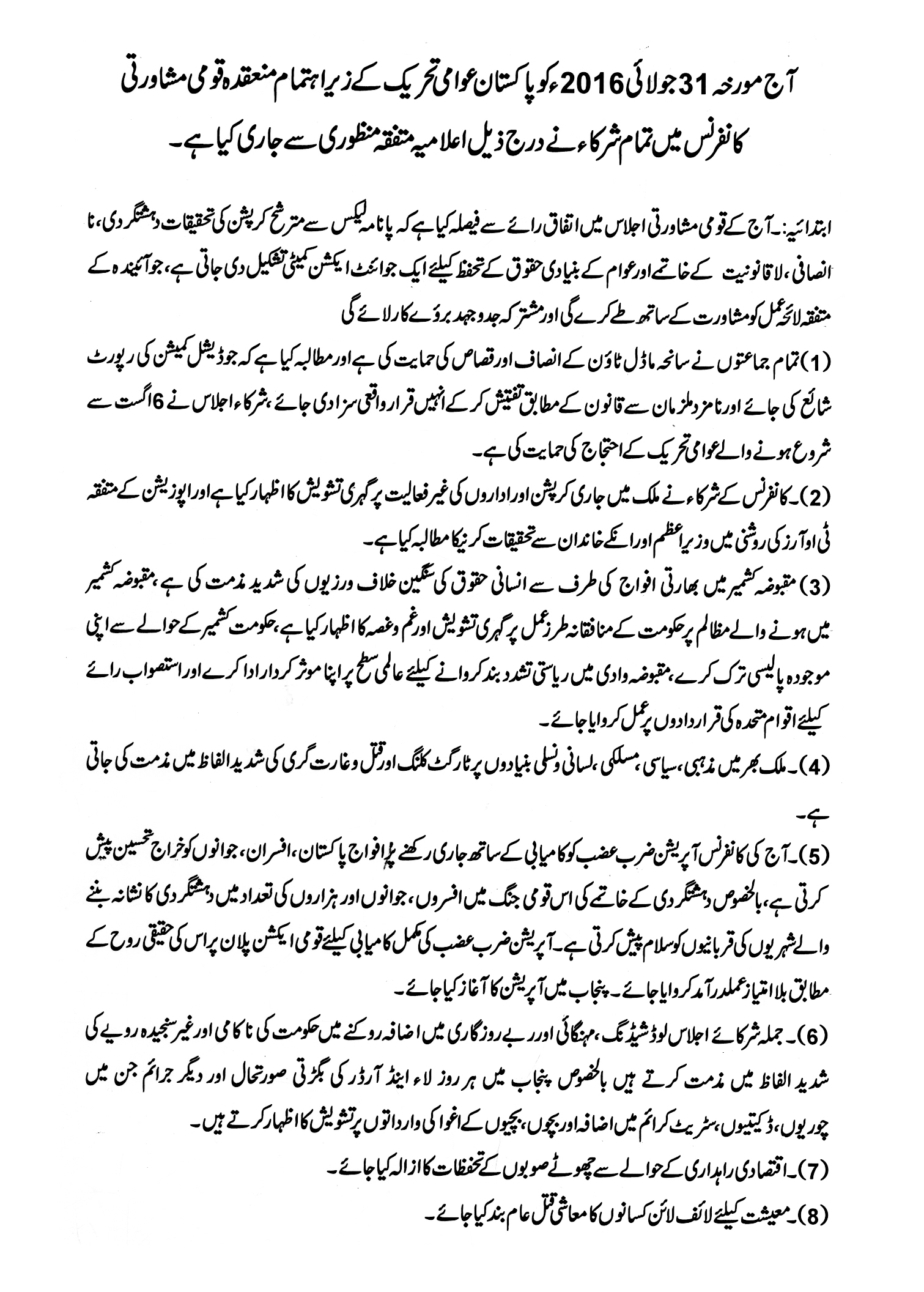 All participants of the National Consultative Meeting held under the banner of PAT on July 31 issued the following communique with complete consensus:
