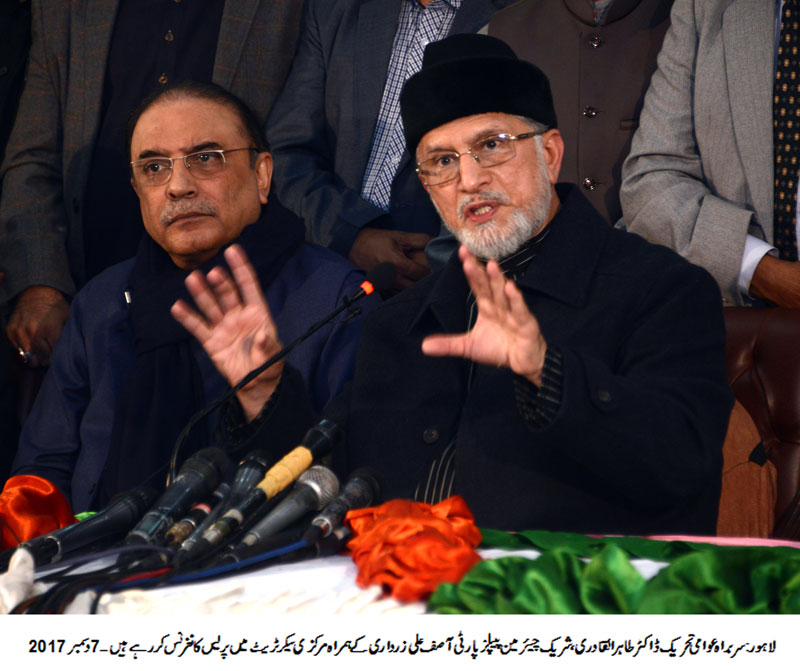 While addressing the joint press conference at the PAT central secretariat on December 7, PAT Chairman Dr Muhammad Tahir-ul-Qadri and PPP Co-chairman and former President Asif Ali Zardari said that Justice Najafi Commission report held the Punjab Chief Minister responsible for Model Town tragedy and he should immediately tender his resignation in the wake of publication of the report. Both leaders strongly condemned the Trump Administration’s decision to recognize Jerusalem as new capital of Israel and demanded a review of the decision. They said that peace process has been dealt a severe blow, adding that the decision violates the UN resolutions most glaringly.