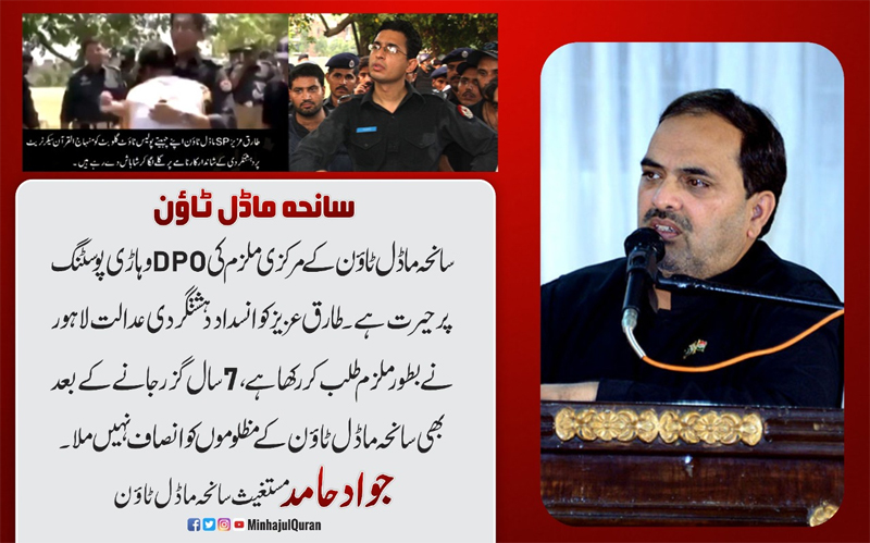 Jawad Ahmad said that the PAT workers were shocked to learn about the posting of Tariq Aziz as District Police Officer Vehari because he is involved in the killing of the 14 innocent workers in Model Town. He said that the important characters and accused of the Model Town case are being accommodated in better positions during the tenure of the present government. He said that seven years have gone by but the oppressed of Model Town tragedy have not got any justice.