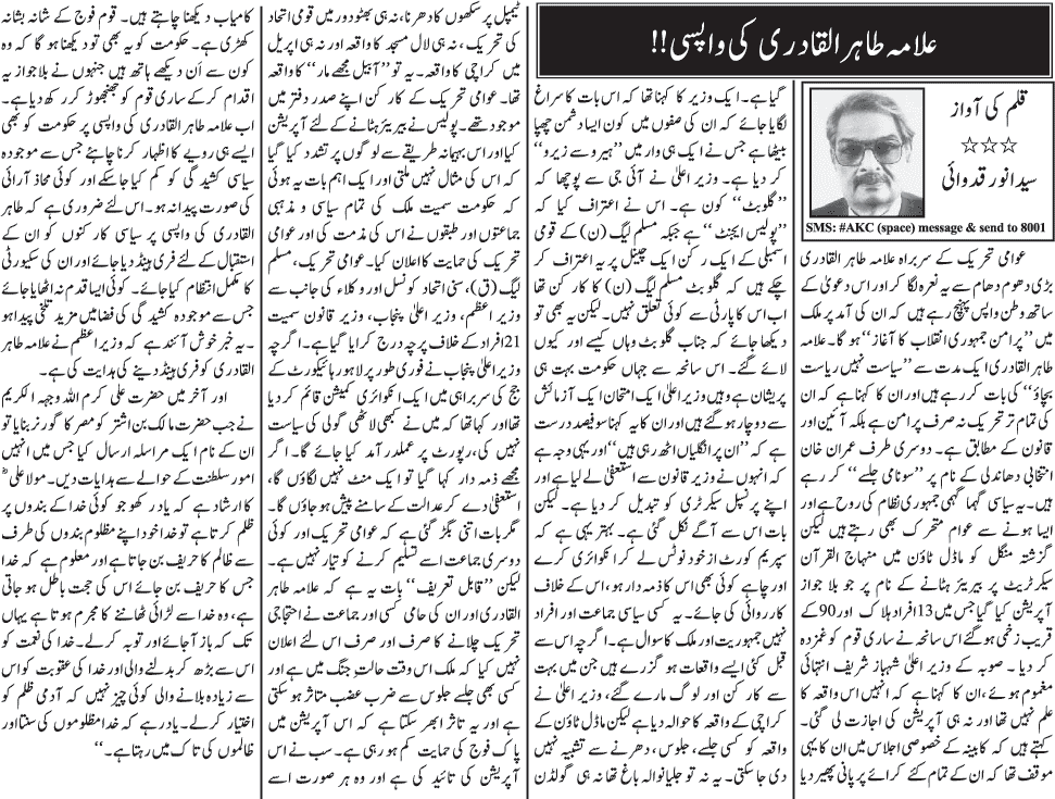 Dr Tahir-ul-Qadri ki Wapsi - by Syed Anwar Qudwai (Daily Jang, 22 June 2014)