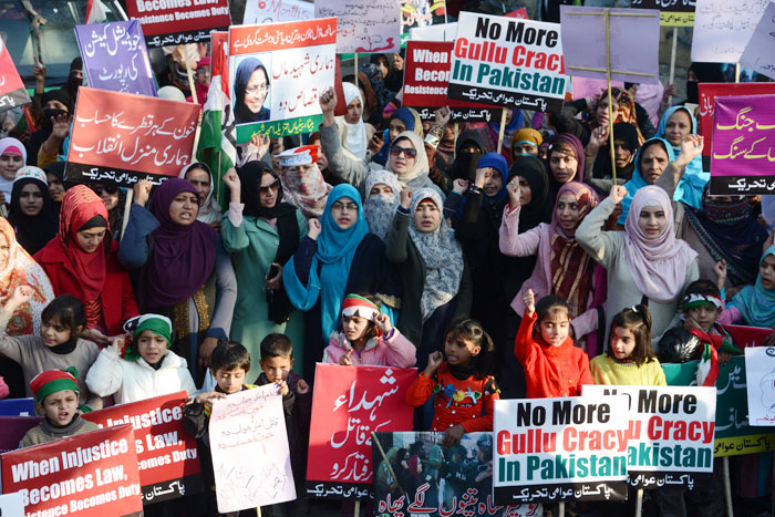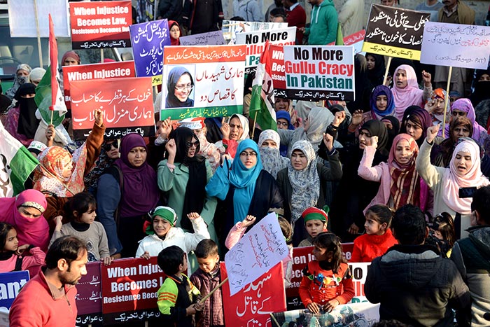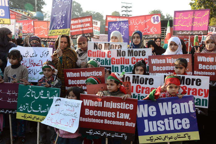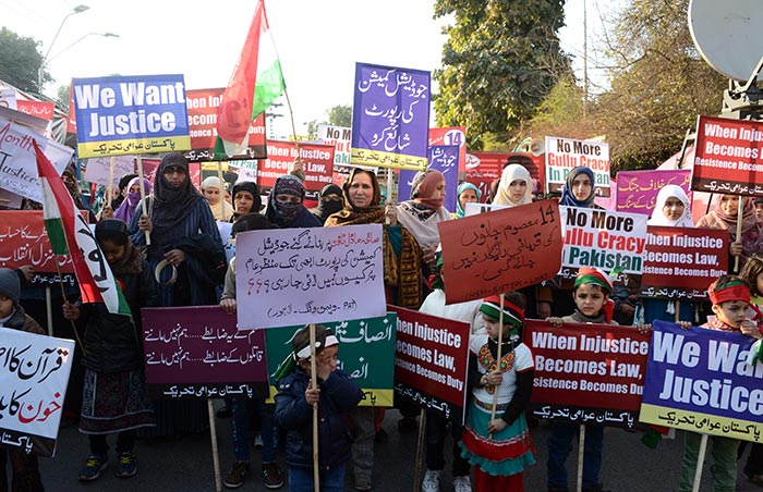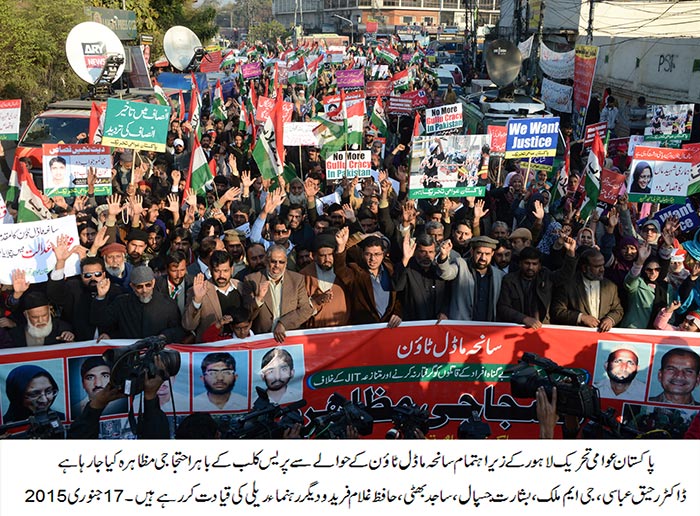 Provincial President of PAT Basharat Aziz Jaspal, Allama Syed Hassan Raza Naqvi of Majlis-e-Wahdat-ul-Muslimeen, Qazi Faiz-ul-Islam, Sajid Mahmood Bhatti, Razia Naveed, Allama Syed Farhat Hussain Shah, Ahmad Nawaz Anjum, Shoaib Tahir, Irfan Yousaf, Raja Nadeem and others also spoke on the occasion. A large number of people including women and children attended the demonstration. The people were holding placards and banners with demands for justice written on them.