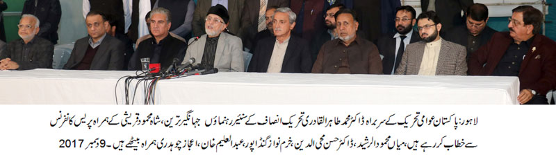 While addressing a press conference along with senior PTI leaders Jahangir Khan Tareen and Shah Mahmood Qureshi who called on him at this residence, PAT Chairman Dr Muhammad Tahir-ul-Qadri has presented three points for justice in the Model Town case. He demanded that (1) Punjab Chief Minister and Rana Sanaullah should immediately resign from their positions. (2) All officers directly or indirectly involved in the Model Town tragedy should leave their jobs till the final conclusion of the case and (3) a neutral and powerful JIT on the pattern of Panama JIT should be constituted to investigate the Model Town massacre. He said that Baqar Najafi Commission report have unmasked the faces of the killers. He said that both Nawaz Sharif and Shahbaz Sharif conceived the plan of massacre; Rana Sanaullah oversaw the implementation whereas the police and administration took part in the execution.